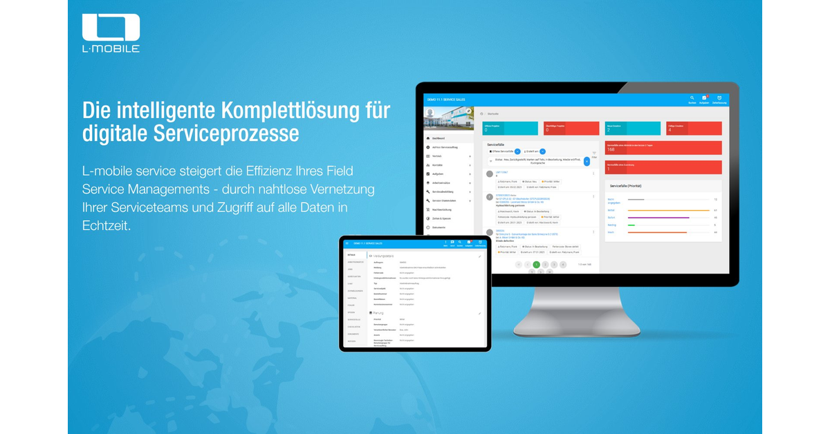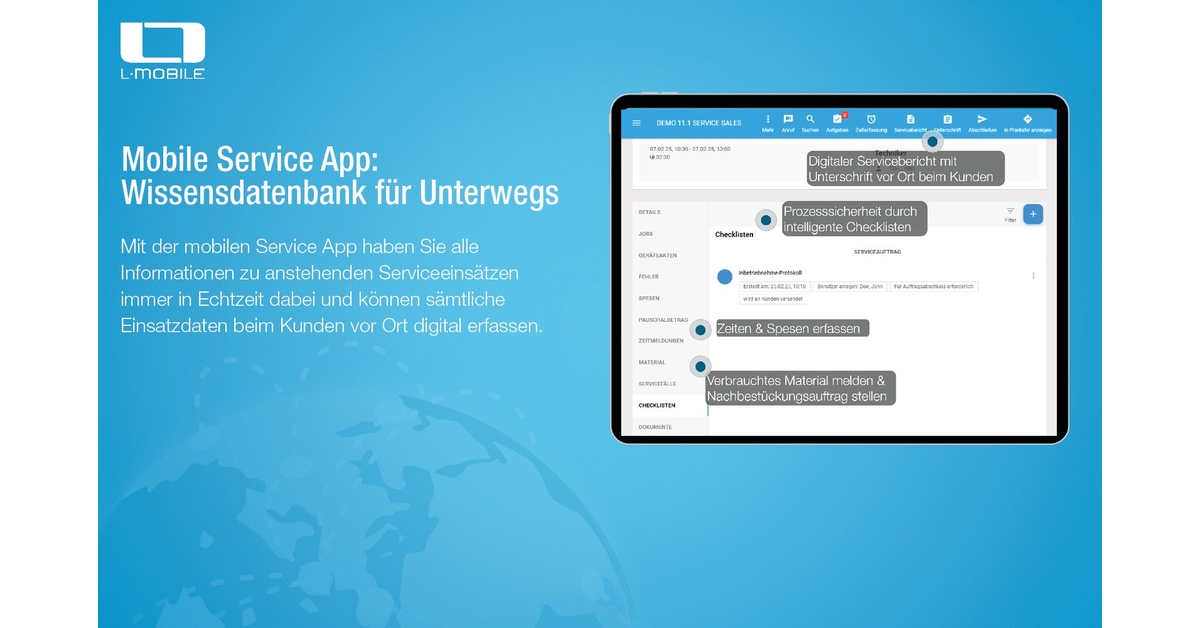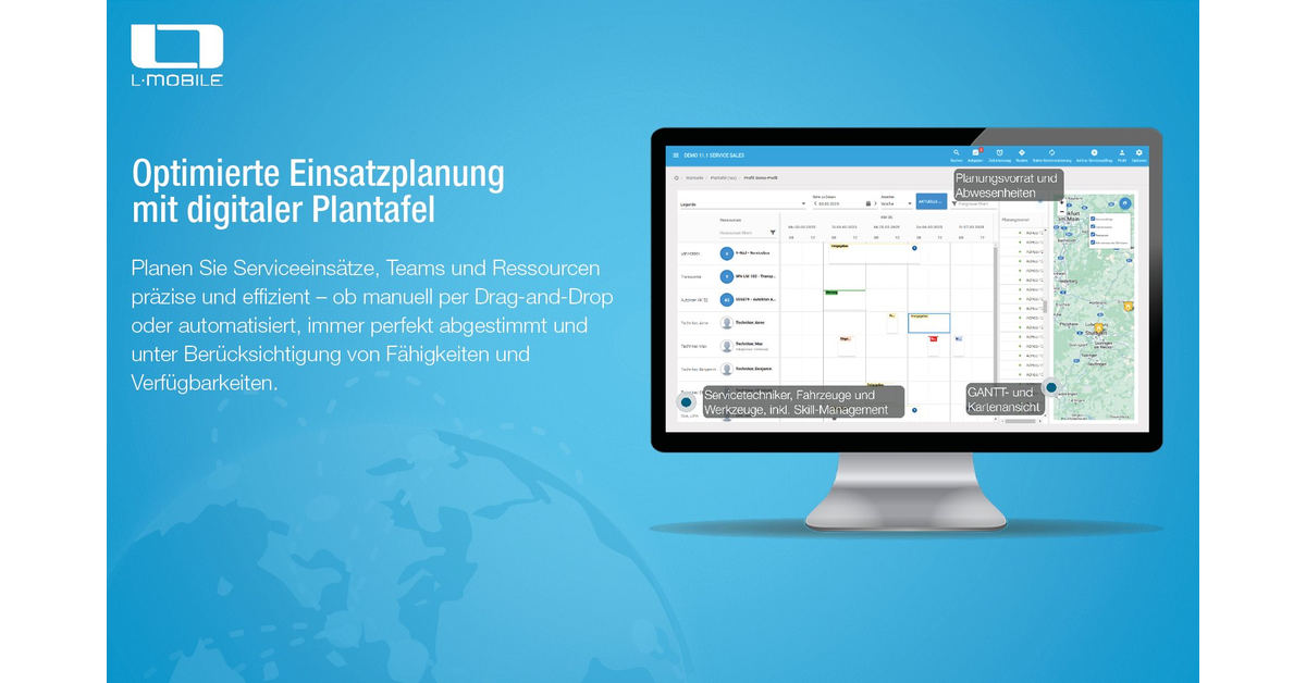 L-mobile service ist eine Field Service Management (FSM) Software, die Serviceteams bei der digitalen Planung, Durchführung und Dokumentation von Einsätzen unterstützt. Die Software kann eigenständig genutzt oder tief in bestehende ERP-Systeme integriert werden. L-mobile service unterstützt entlang des gesamten Serviceprozesses. Über die digitale Plantafel planen Disponenten Teams, Fahrzeuge und Ressourcen– manuell oder automatisiert. Damit behalten Disponenten stets den Überblick über Ressourcen und Auslastung. Servicetechniker können über die mobile Service App jederzeit auf alle Auftragsdaten zugreifen. Sie erfassen Arbeitszeiten, Materialien und erbrachte Leistungen direkt vor Ort. Dynamische Checklisten sichern eine vollständige und nachvollziehbare Dokumentation. Damit sichert L-mobile service den nahtlosen Informationsfluss innerhalb der Serviceteams. Klare Abläufe, aktuelle Daten und schnelle Nachbearbeitung erhöhen die Servicequalität.