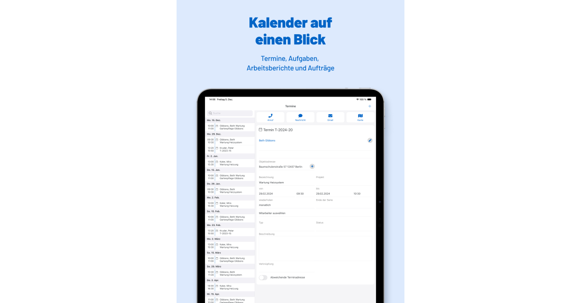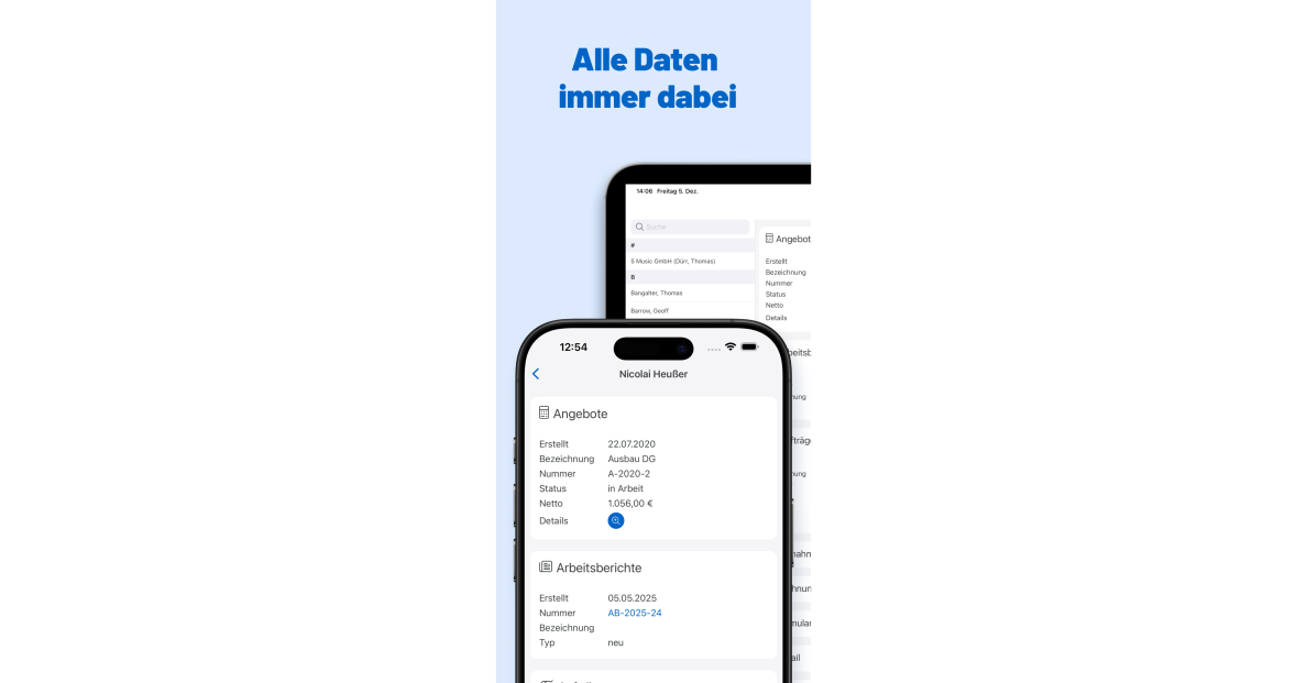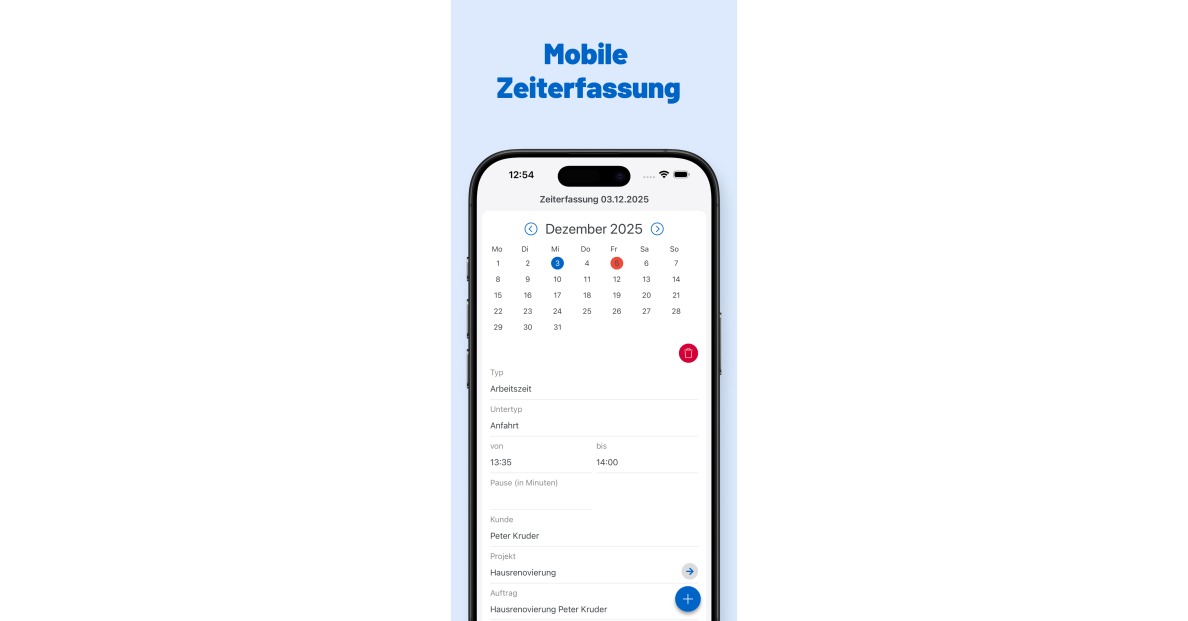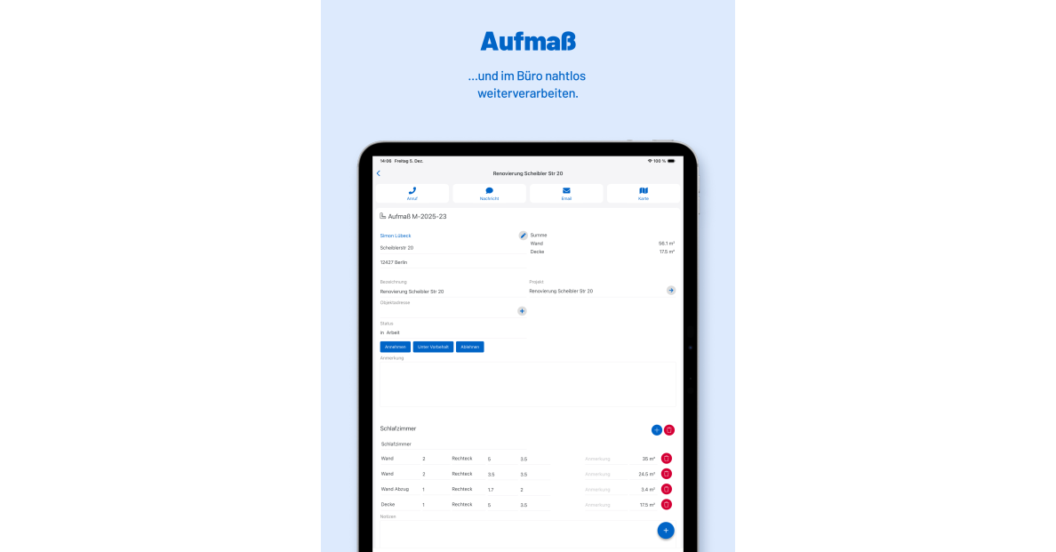 Das Programm ist die professionelle Softwarelösung für Handwerksbetriebe jeder Größe und aus allen Gewerken. Wir haben, was dein Betrieb braucht! Aufmaß für jedes Gewerk! Mess doch was Du willst! Im Programm legst Du eigene Aufmaßtypen fest. Elektrikerinnen zählen Steckdosen in Stückzahl, SHK-ler Rohre in laufendem Meter, Dachdeckerinnen den Traufüberstand DF1 in Meter, Gala-Bauer den Oberboden in Quadratmeter und so weiter. INTEGRIERTE ZEITERFASSUNG Egal ob via Stoppuhr oder mittels analogem Nachtrag, direkt aus der App oder zu Hause im Browser, das Programm erfasst nicht nur Deine Arbeitszeit. Die Daten fließen nahtlos in die Nachkalkulation Deines Auftrags - zwei Fliegen mit einer Klappe! CLEVERES PROJEKT- UND TERMINMANAGEMENT Nichts ist wichtiger als die reibungslose Zusammenarbeit deines Teams. Im Programm passt Du das Projektmanagement auf die Bedürfnisse Deines Teams an, machst aus projektbezogenen Daten wie beispielsweise Mängelberichten Projektaufgaben und schickst diese per Push-Nachricht an die App deiner Mitarbeiter:innen. Die Einsatzzeiten landen im Terminplaner, so hast Du die Ressourcen Deines Betriebs auf einen Blick parat. UND VIELES MEHR Jetzt 14 Tage kostenlos testen!
