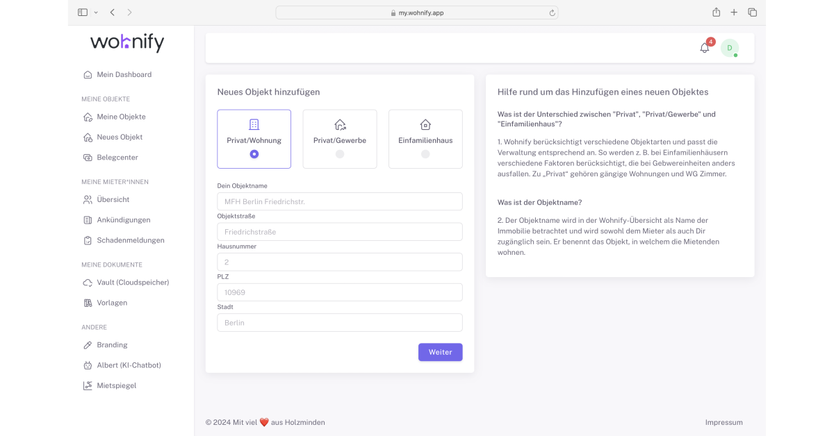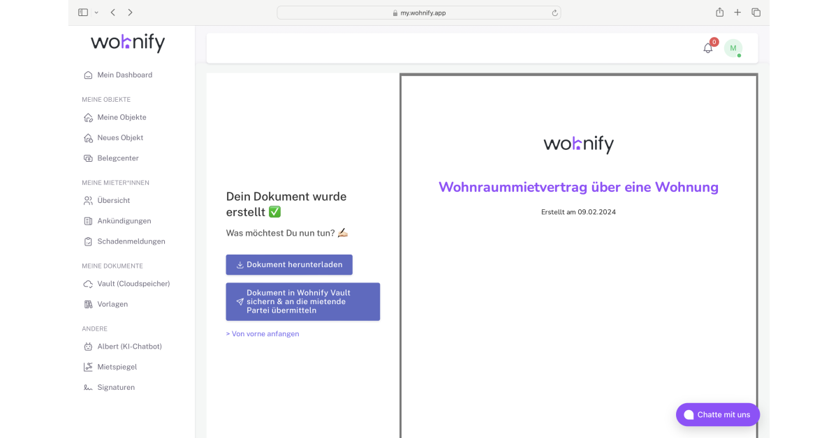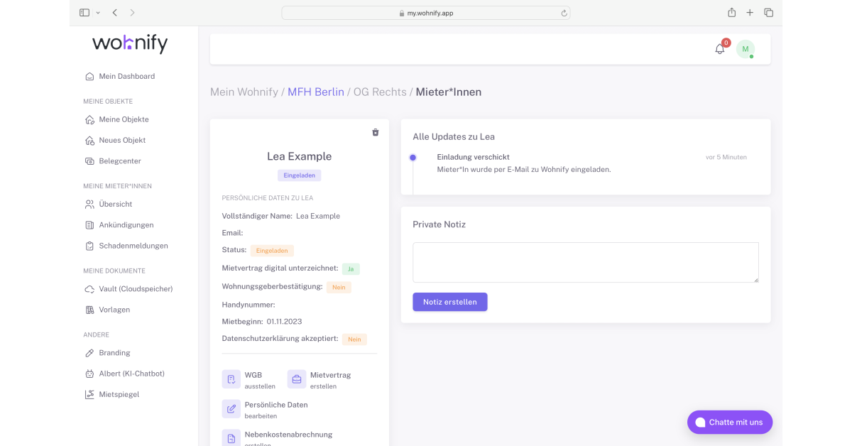 Wohnify ist eine digitale Plattform, die speziell für die Bedürfnisse von Vermietern und Mietern im Bereich der Immobilienverwaltung entwickelt wurde. Ziel von Wohnify ist es, den Prozess der Verwaltung von Immobilien zu vereinfachen und zu optimieren, indem es eine breite Palette von digitalen Werkzeugen und Dienstleistungen anbietet. Die Plattform deckt verschiedene Aspekte der Immobilienverwaltung ab, von der Erstellung und Verwaltung digitaler Mietverträge über die Durchführung transparenter Nebenkostenabrechnungen bis hin zur Unterstützung bei der Wohnungsübergabe und -übernahme.
