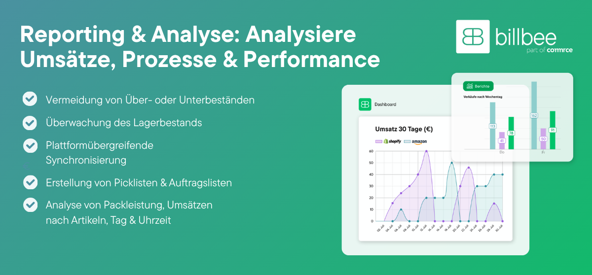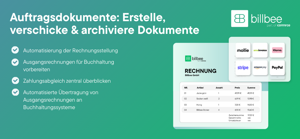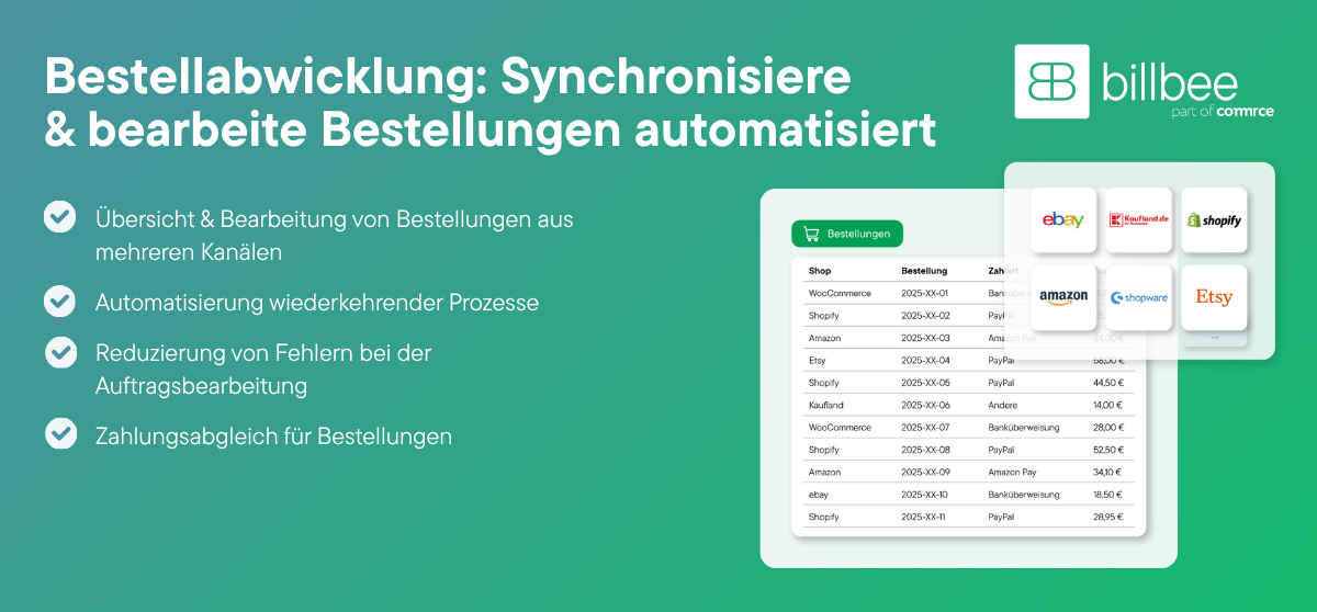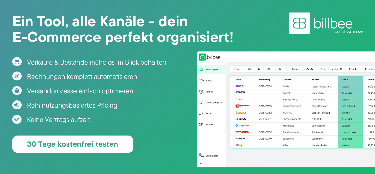 Billbee ist eine einfache und intuitiv zu bedienende, jedoch sehr umfangreiche Lösung zur Artikelverwaltung, Auftragsabwicklung und Automatisierung für E-Commerce Händler:innen, die mit ihren Produkten auf einem oder mehreren Kanälen aktiv sind. Mit der cloud-basierten Software können alle relevanten Prozesse im Handelsumfeld abgewickelt werden: Angefangen bei der Kommunikation mit Kund:innen, der automatisierten Erstellung verschiedener Auftragsdokumente, dem Versand, weiteren After-Sales Prozessen bis hin zur Verwaltung des Warenbestands. Die Prozesse werden entweder direkt in Billbee abgebildet oder über ein oder mehrere der mehr als 100 Schnittstellen zu Shopsystemen, Marktplätzen, Buchhaltungstools, Versand- oder auch Zahlungsdienstleistern integrieret. Die Billbee API ermöglicht es ebenfalls eine eigene Software oder verschiedene Dienstleister z. B. aus dem Bereich Fulfillment anzubinden.