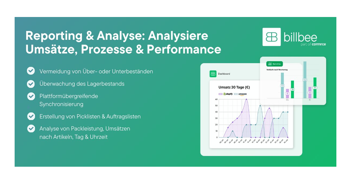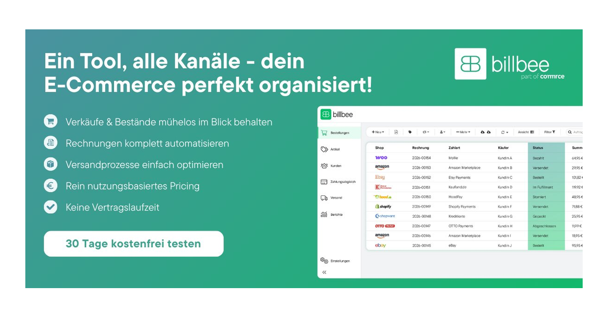 Billbee ist eine einfache und intuitiv zu bedienende, jedoch sehr umfangreiche Lösung zur Artikelverwaltung, Auftragsabwicklung und Automatisierung für E-Commerce Händler:innen, die mit ihren Produkten auf einem oder mehreren Kanälen aktiv sind. Mit der cloud-basierten Software können alle relevanten Prozesse im Handelsumfeld abgewickelt werden: Angefangen bei der Kommunikation mit Kund:innen, der automatisierten Erstellung verschiedener Auftragsdokumente, dem Versand, weiteren After-Sales Prozessen bis hin zur Verwaltung des Warenbestands. Die Prozesse werden entweder direkt in Billbee abgebildet oder über ein oder mehrere der mehr als 100 Schnittstellen zu Shopsystemen, Marktplätzen, Buchhaltungstools, Versand- oder auch Zahlungsdienstleistern integrieret. Die Billbee API ermöglicht es ebenfalls eine eigene Software oder verschiedene Dienstleister z. B. aus dem Bereich Fulfillment anzubinden.